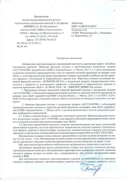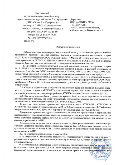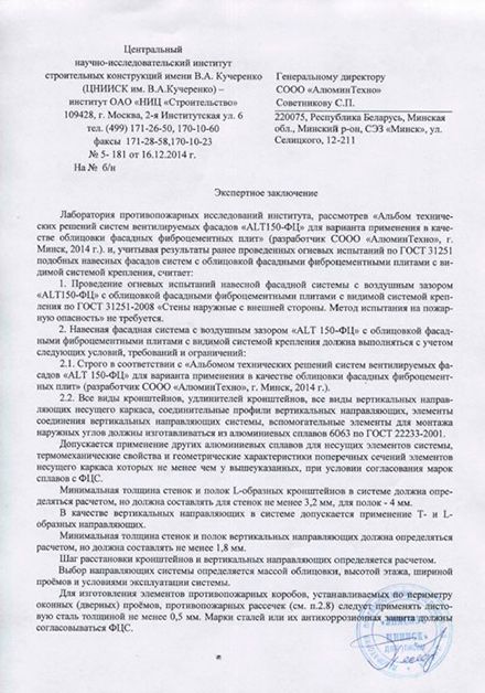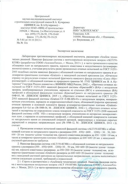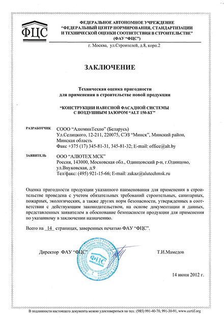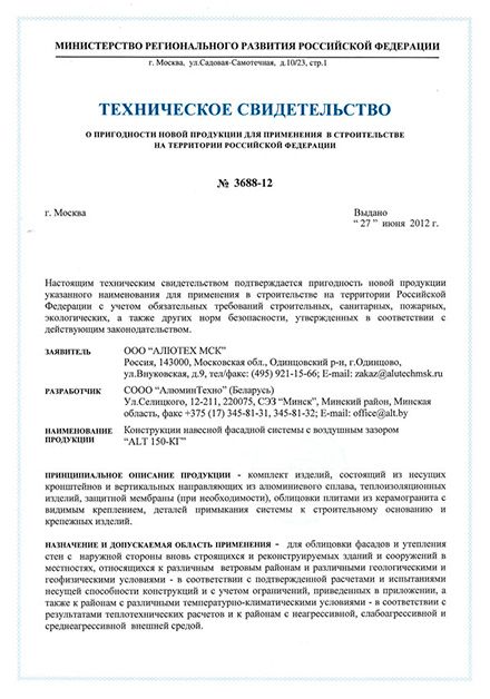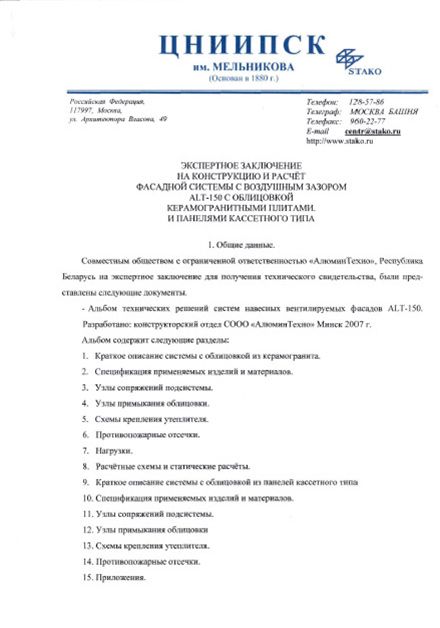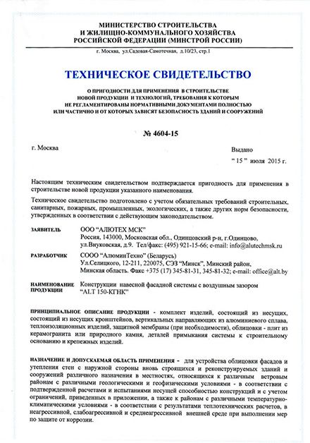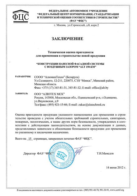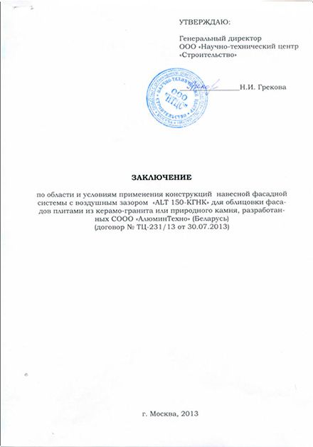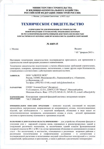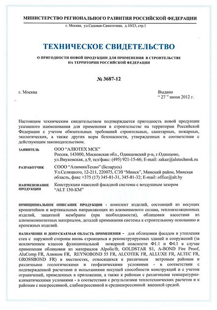 Система Alutech ALT 150 предназначена для навесных вентилируемых фасадов с различными видами облицовочных материалов: фиброцемент, керамогранит, натуральный камень. Система имеет высокий запас прочности, что позволяют применять ее на зданиях высотой до 150 м в 5-ом ветровом районе. Параметры подтверждены экспертным заключением и расчетами, выполненными специалистами ЦНИИПСК им. Мельникова (Москва).