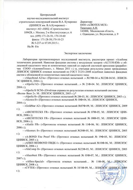 Система ALT 150 полностью отвечает пожарно-техническим требованиям, предъявляемым к внешним стенам зданий самого разного назначения. Alutech ALT 150 — это огнестойкость до I степени включительно и класс конструктивной пожарной опасности до С0 включительно. Класс пожарной опасности системы — К0.